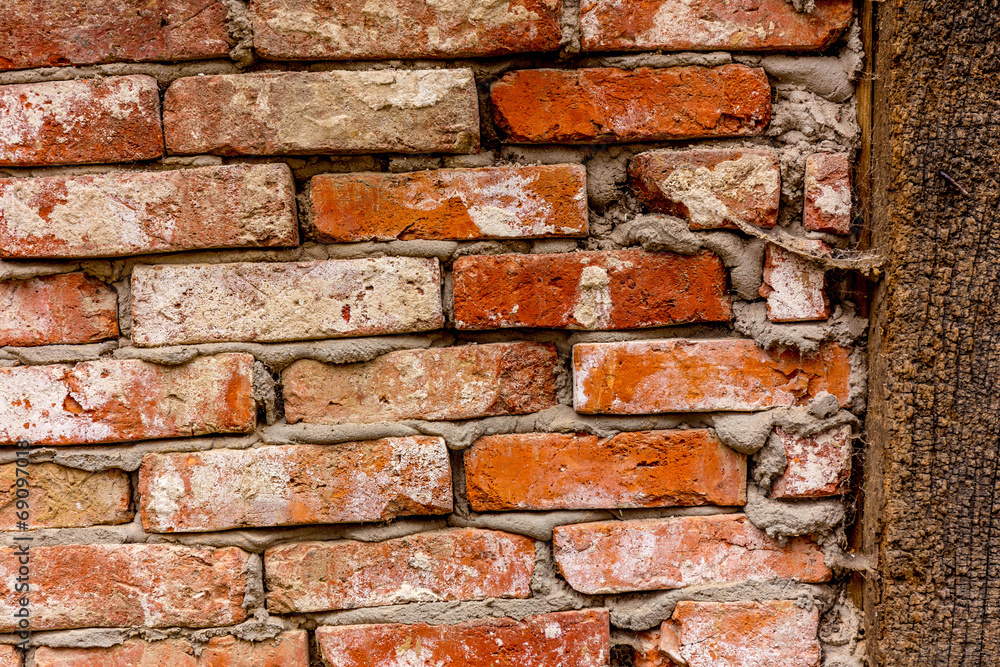 Textured urban brick wall with weathered red and gray bricks showcasing rustic charm and urban decay in a city environment