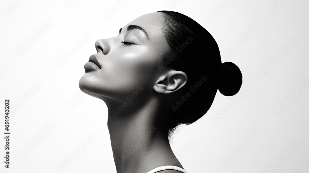 Image of a woman in side profile, captured in black and white, set against a seamless white backdrop with high contrast