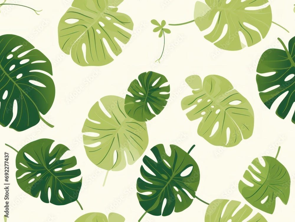 Tropical pattern showcases green monstera deliciosa leaves scattered across a cream background with soft pink circles.