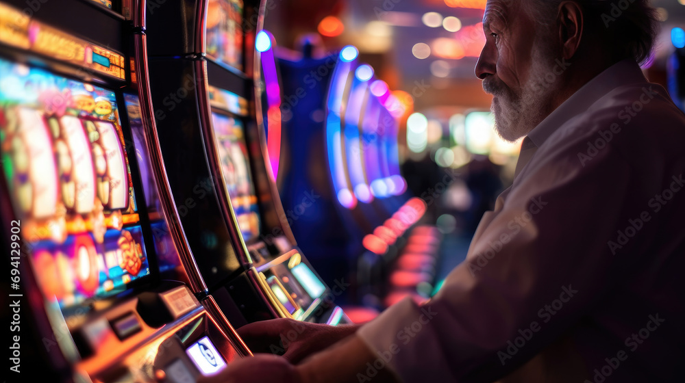 portrait of elderly man gambler playing slot machine in casino. Slot Machines in Las Vegas. Grandma addicted to fruit machines excited