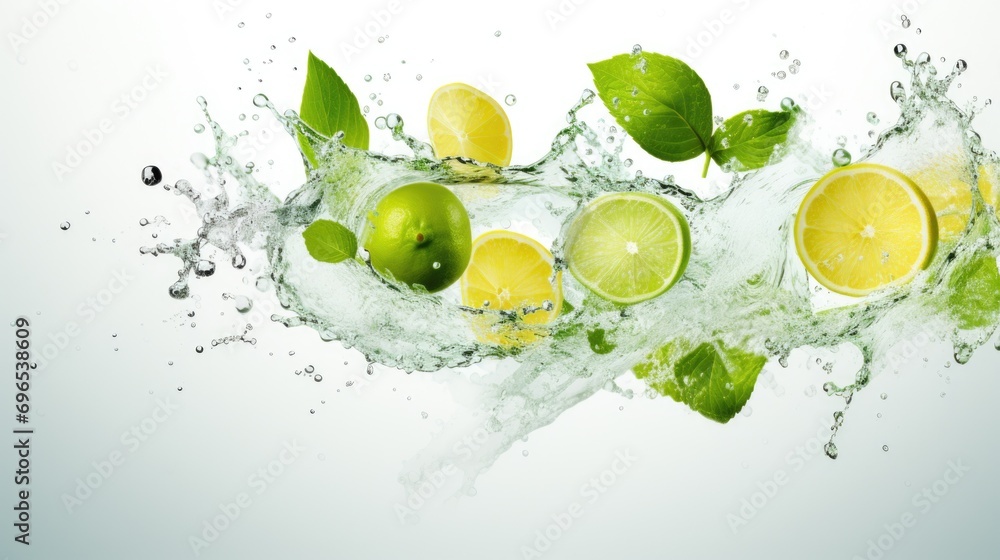 Lemons and limes being dropped into a glass of water creatin Wallpaper