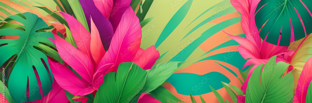 tropical background - Transport yourself with palm leaves, exotic flowers, and beach sand in tropical greens, vibrant oranges, and sunset pinks, Generative AI