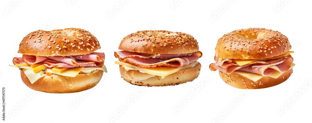 Set Of Ham Cheese Bagel Isolated On Transparent Background.