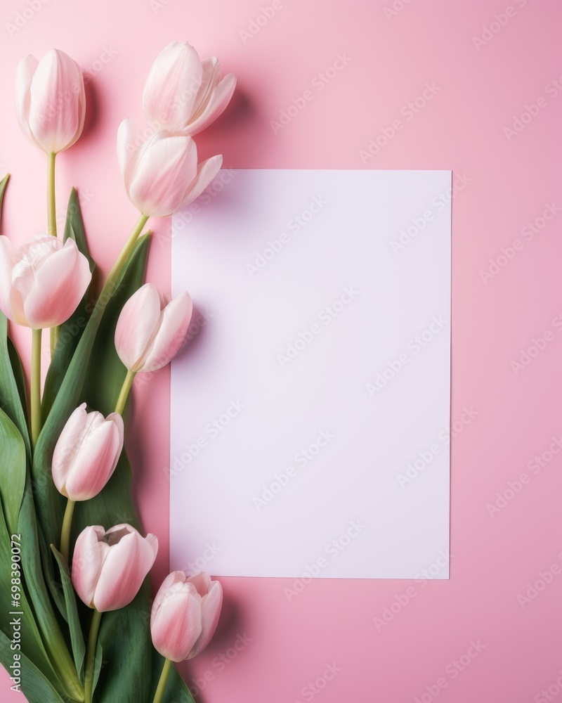 Elegant Pink Tulips and Blank Card on a Pastel Pink Background