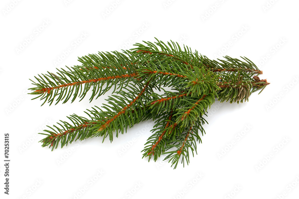 Fresh green spruce branch isolated on white background