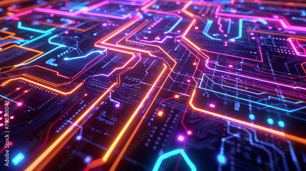 An electronic circuit board with glowing pink and blue neon lights
