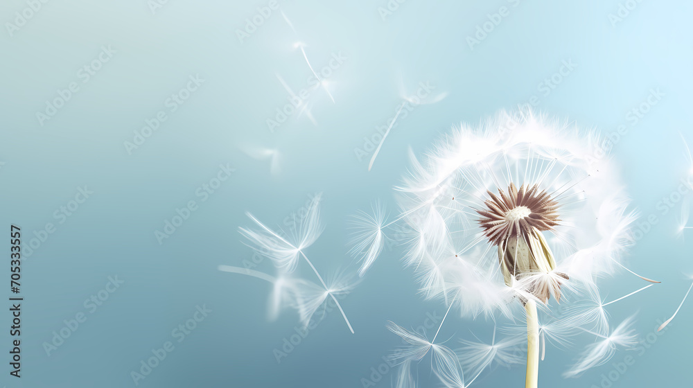 dandelion seeds flying away with wind on pale purplish pink background.