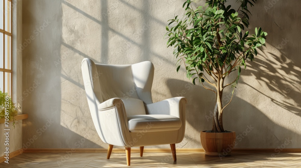 Cozy Armchair In Soft Beige Beside Tall Leafy Wallpaper Mural - Decorly Solutions | Decorly Solutions