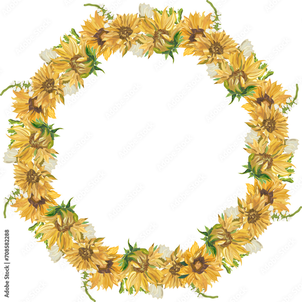 Sunflower Wreath Frame Illustration On Transparent Background.