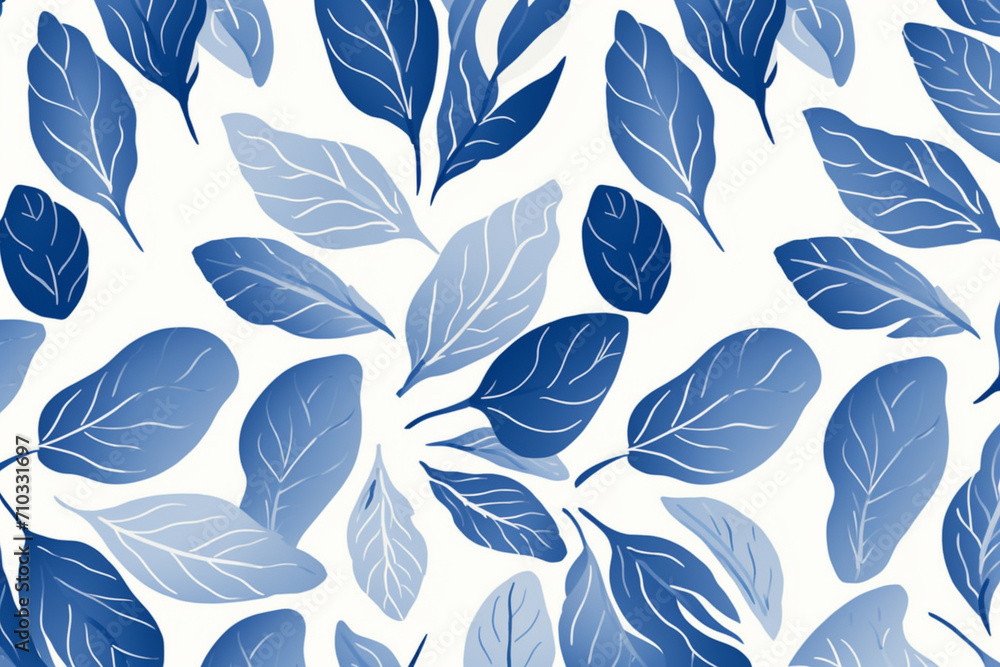 A seamless pattern of blue and white leaves on a white backg Wallpaper