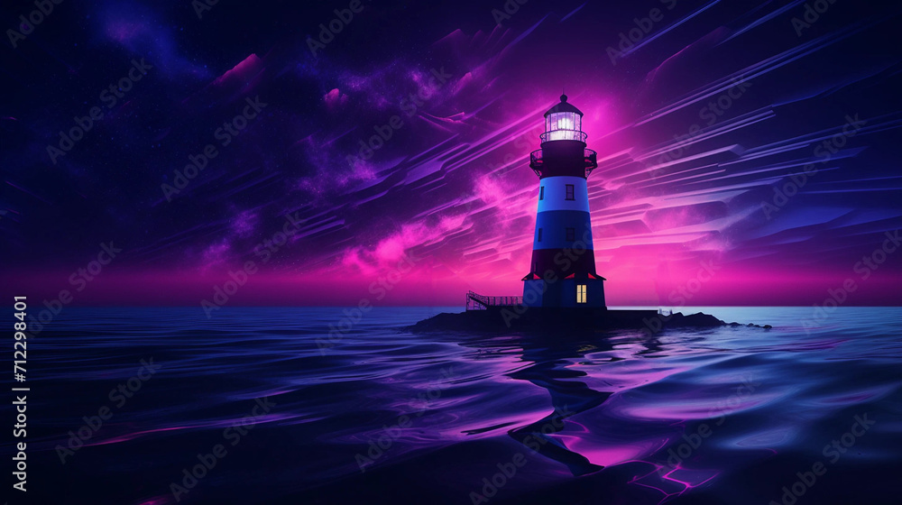 Graphic Art Lighthouse at Night Set Against a Pink and Violet Sky