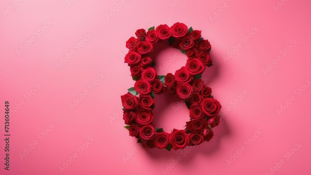 Women's Day concept for March 8th. The number 8 on a pink background with pink roses