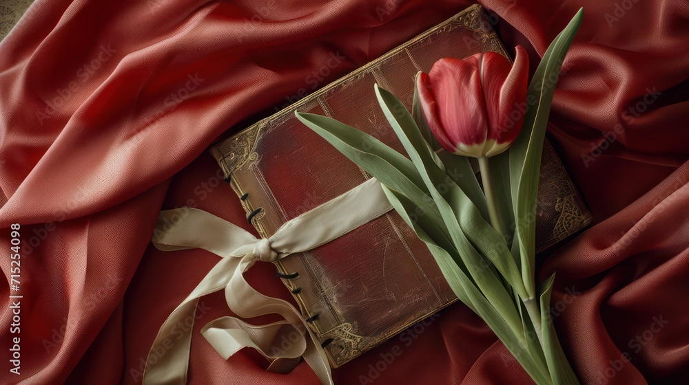 A ancient book ribbon and a flower on soft silk Romance conc Wallpaper