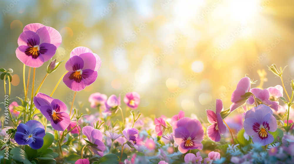 Spring Flower Bed With Blooming Viola Tricolor Against Wallpaper Mural - Decorly Solutions | Decorly Solutions