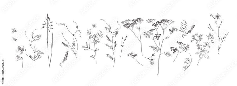 Field Flowers And Grasses Line Drawing Vector Illustration Wallpaper Mural - Decorly Solutions | Decorly Solutions