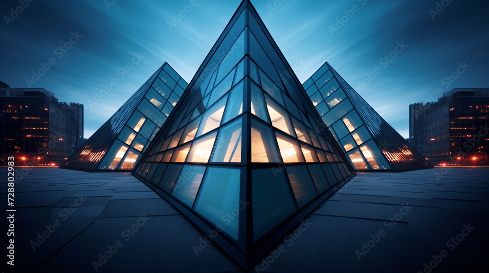 Modern Office Building Exterior Reflecting Cityscape at Sunset, Showcasing Architectural Design and Urban Development