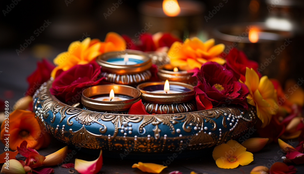 Glowing candle illuminates tranquil table, symbolizing spirituality and celebration generated by AI