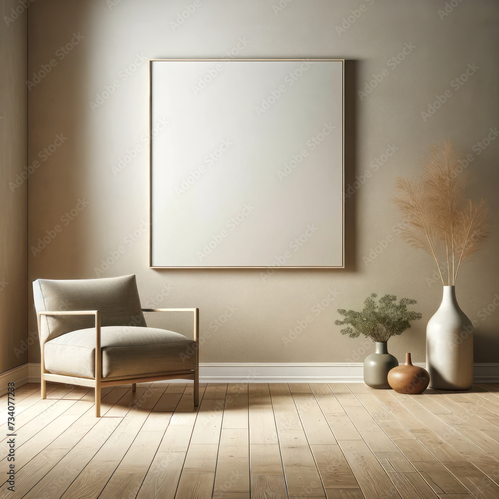 Modern Living Room Interior with Empty Frame Armchair and Cozy Decor for Mockup and Design Presentation