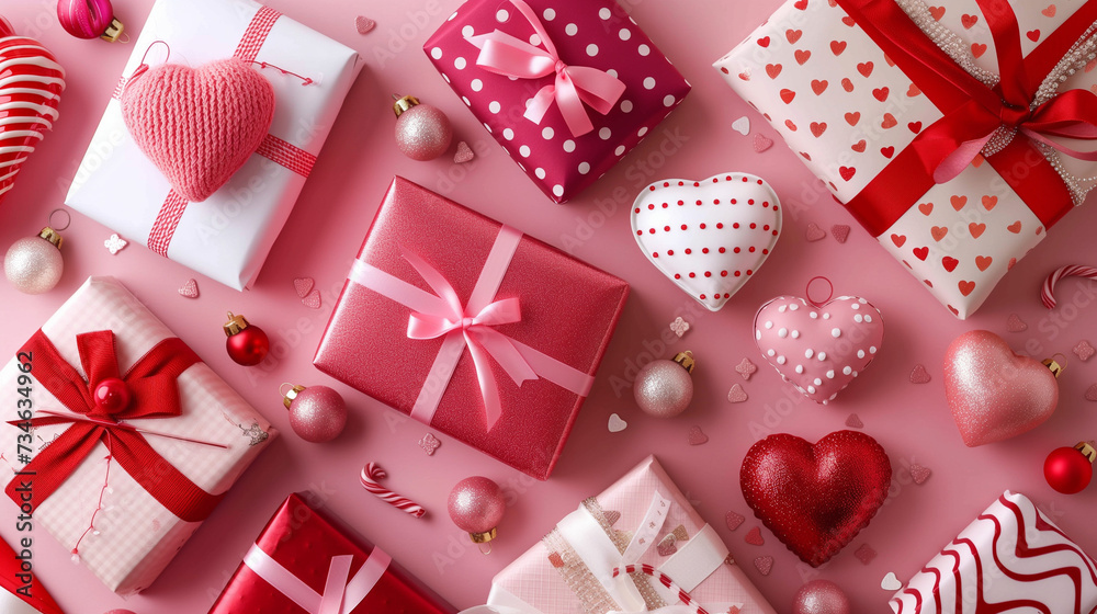 Valentine's Day gifts with red ribbons on a red background, surrounded by hearts and Cupid's arrow decorations