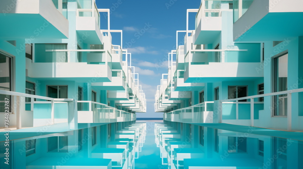 Modern concrete building balconies with glass railings and geometric blue hexagonal shapes on white background