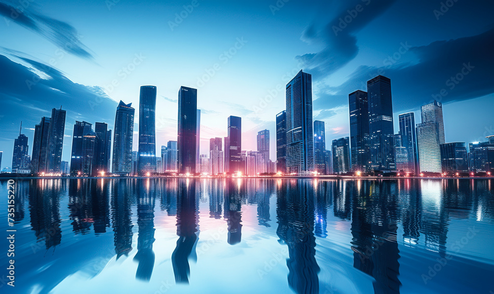 Reflective Waterfront Panorama Of Modern City Skyline With Wallpaper Mural - Decorly Solutions | Decorly Solutions