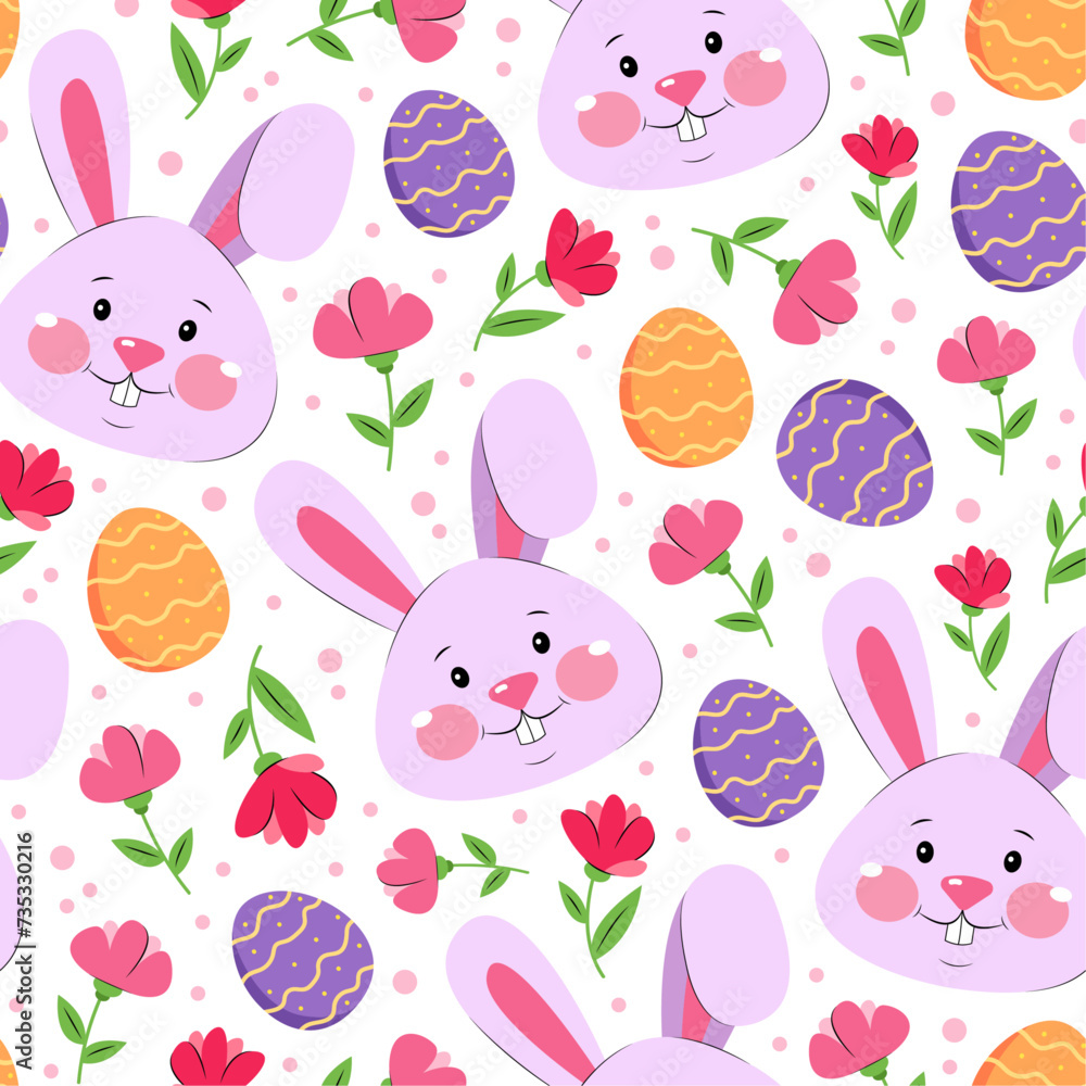 Whimsical Easter themed seamless pattern with bunny faces, eggs, and flowers on light background. easter seamless