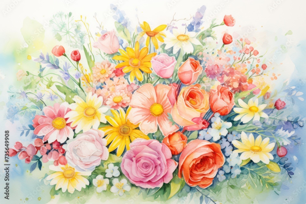 Colorful watercolor spring and summer flowers on white background, spring, summer, flowers, colorful, watercolor, pattern