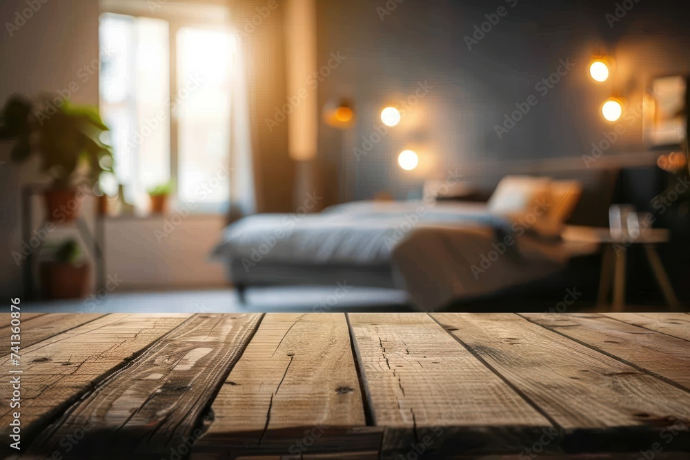 Empty wooden table and blurred bed room background Wallpaper