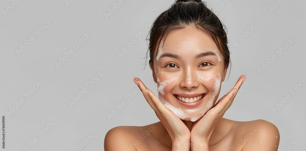 Close-up portrait of smiling asian woman washing face with s Wallpaper