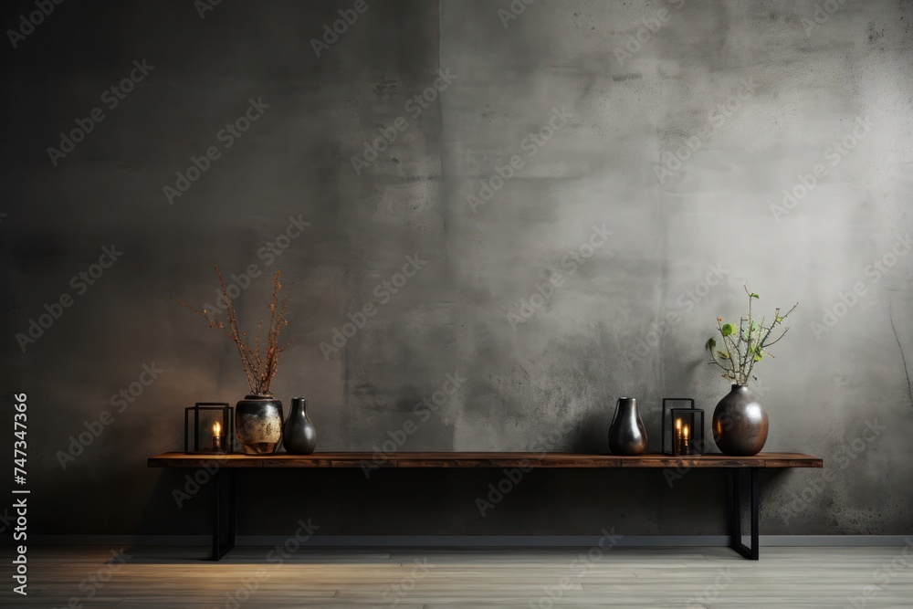 Interior Room Gray Walls Concrete Background and Cement Floor Shelves
