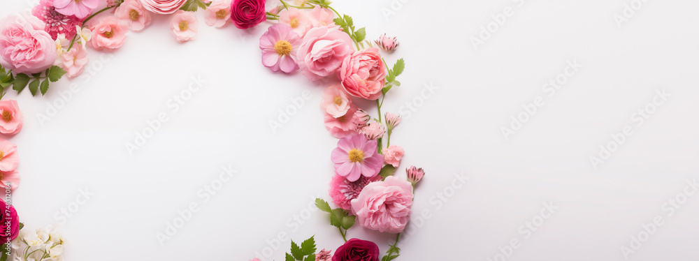 Delicate pink flowers arranged in a beautiful wreath shape on a soft pink background, providing ample copy space, captured in a flat lay top view.