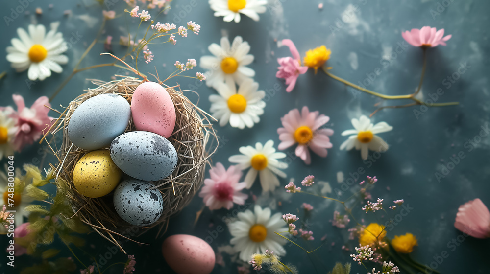 Easter eggs nestled among spring flowers, symbolizing renewal and vibrant beginnings.
