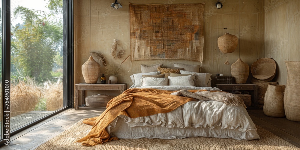 Boho Scandinavian Style In Farmhouse Interior Beige Bedroom Wallpaper Mural - Decorly Solutions | Decorly Solutions