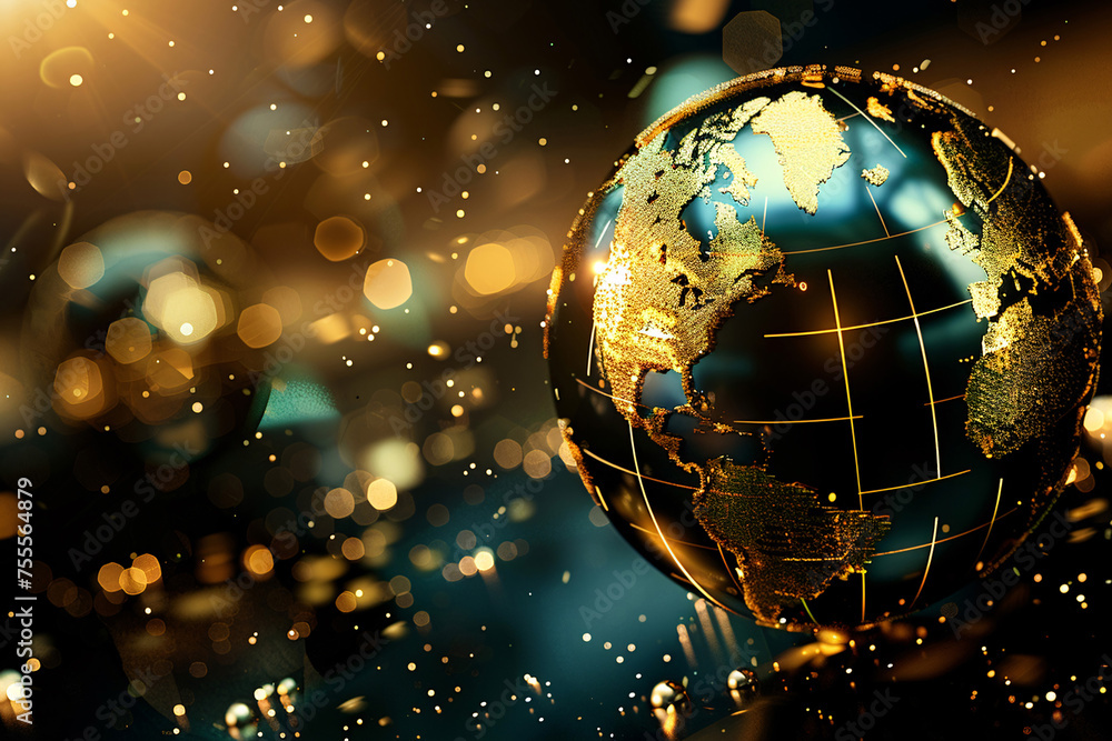 Golden trophy award is shining under spotlight with glittering bokeh effect on dark background, celebrating success, achievement and victory
