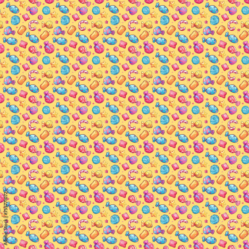 Seamless repeating pattern illustration of colorful sweets a Wallpaper
