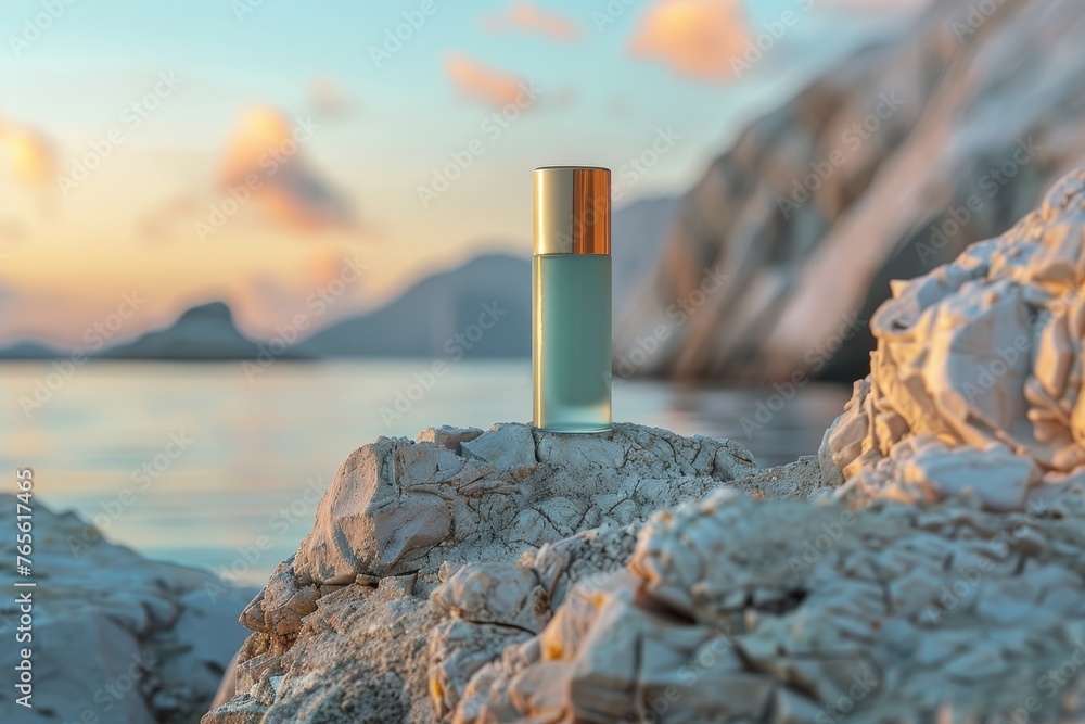 Mockup Luxury Skincare Bottle At Golden Hour Seaside Wallpaper Mural - Decorly Solutions | Decorly Solutions