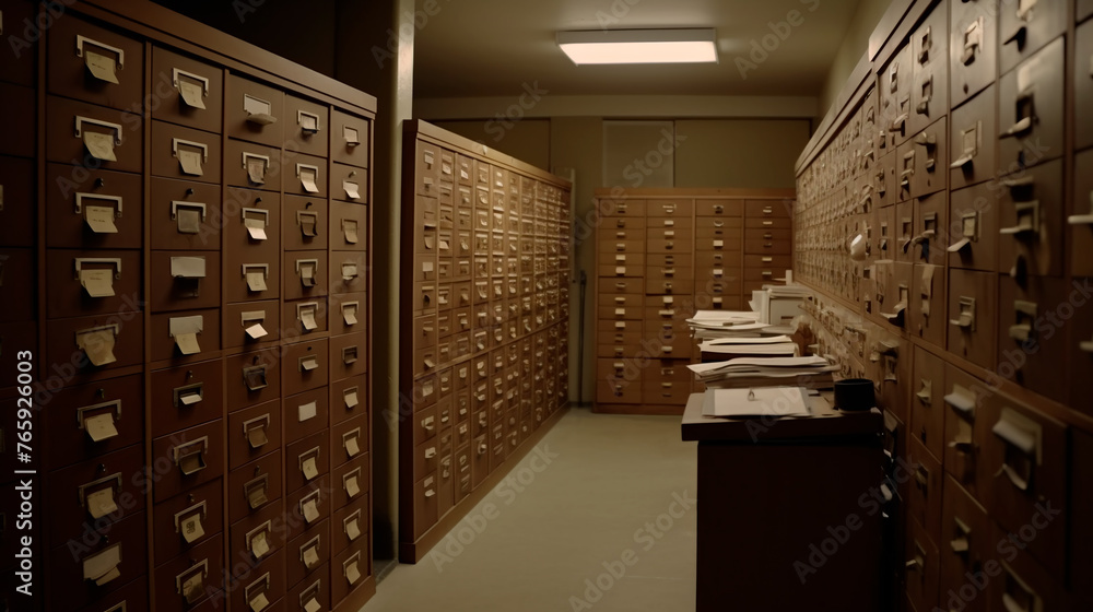 A Room With Many Filing Cabinets And A Desk With Papers On It
