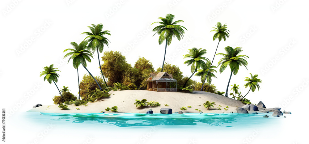 A lush tropical island with tall green palm trees and turquoise waters, painted in soft watercolors, isolated on white