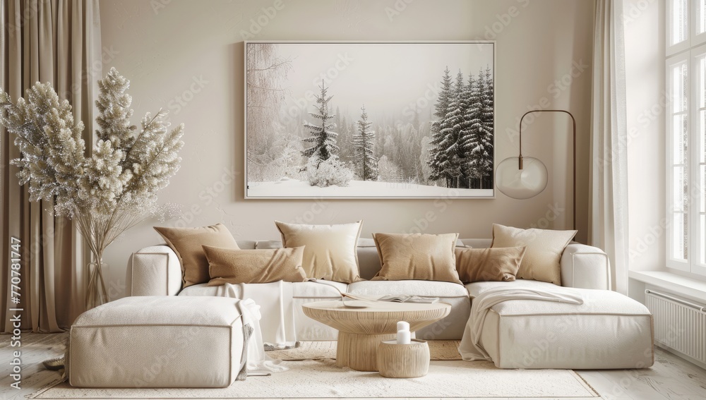 Elegant living room with a framed print of a beautiful winte Wallpaper