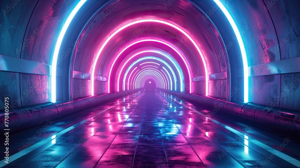 Vibrant Neon Tunnel with Futuristic Archways and Reflective Floor.