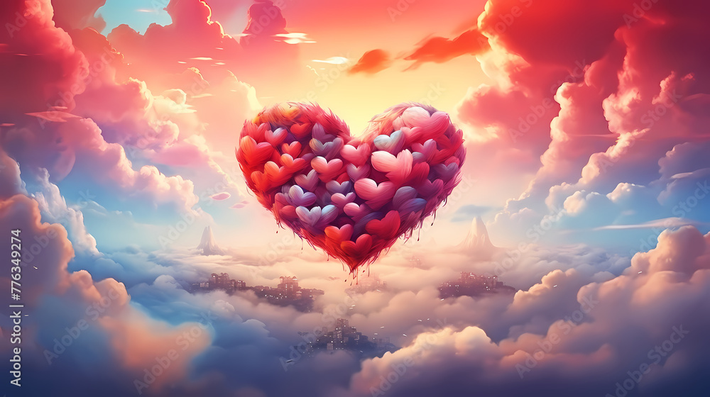 Valentines day heart above clouds with floating hearts