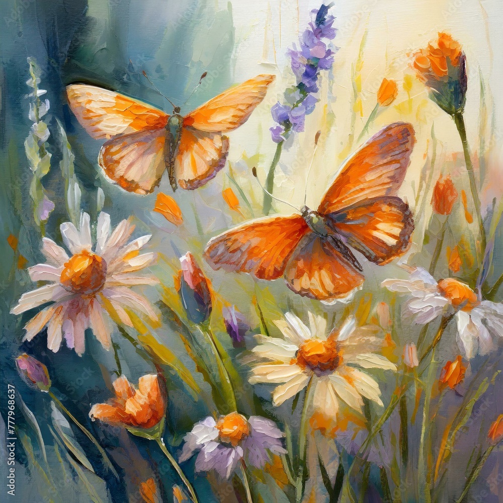 Delicate Wildflowers And Orange Butterflies Painted With Oil Wallpaper Mural - Decorly Solutions | Decorly Solutions