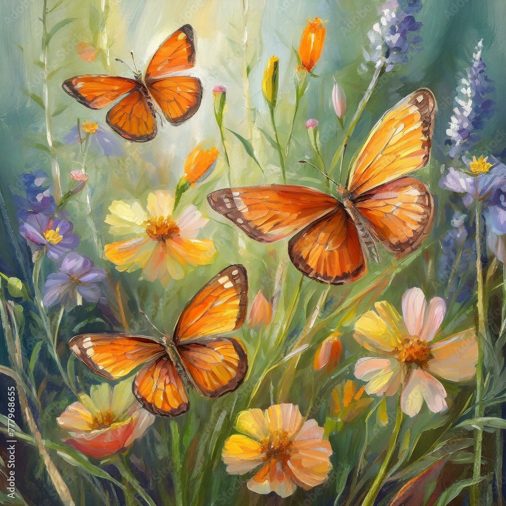 Delicate Wildflowers And Orange Butterflies Painted With Oil Wallpaper Mural - Decorly Solutions | Decorly Solutions
