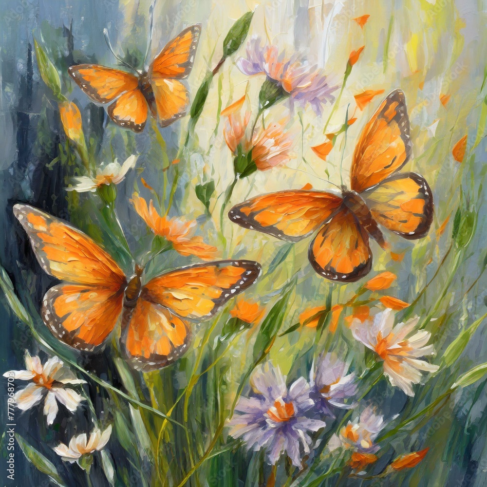 Delicate Wildflowers And Orange Butterflies Painted With Oil Wallpaper Mural - Decorly Solutions | Decorly Solutions