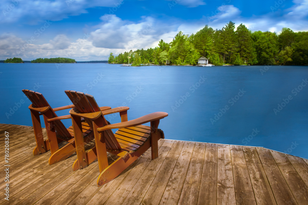 Two Adirondack Chairs Rest Peacefully On A Wooden Wallpaper Mural - Decorly Solutions | Decorly Solutions