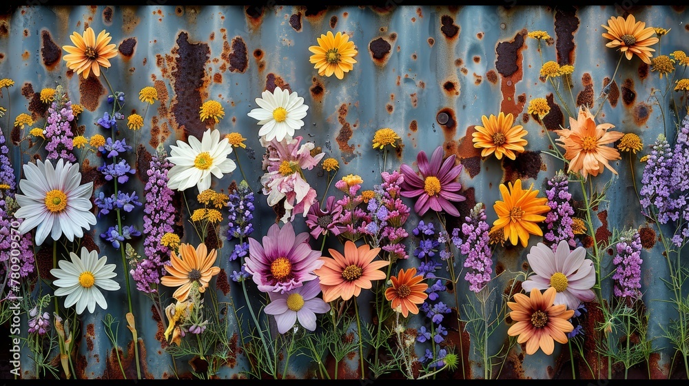 A rusted metal wall painted orange yellow purple and white b Wallpaper