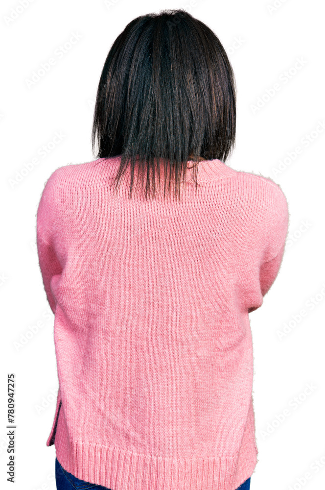 Young beautiful hispanic woman with short hair wearing casual sweater and glasses standing backwards looking away with crossed arms