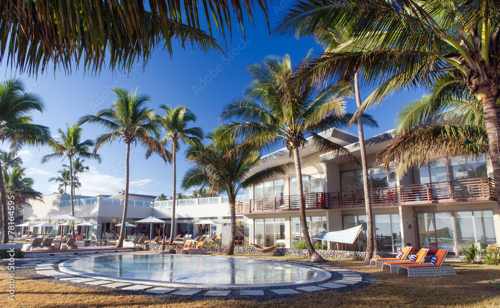 Panoramic View at Swiming-Pool inside a Luxury Sub-Tropical Resort by Morning Light