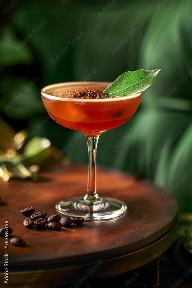 An Inviting Coffee Cocktail Elegantly Served In A Martini Glass, Garnished With A Sage Leaf, Surrounded By Scattered Coffee Beans