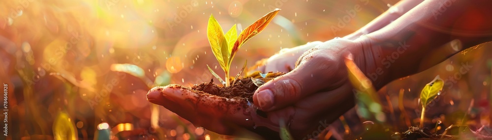 1Hand holding seedlings in soft sunlight closeup warm colors Wallpaper